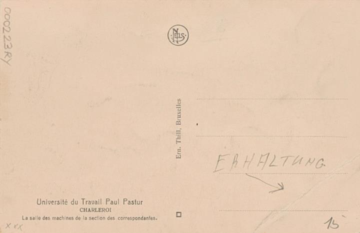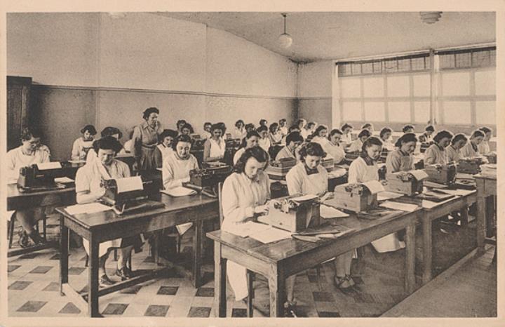 Illustrierte Postkarte; Fotografie, monochrom Rückseite: Unterrichtsraum mit Schülerinnen beim Maschinenschreiben Vorderseite mit Beschreibungstext; Université du Travail Paul Pastur. La salle des machines [...]
