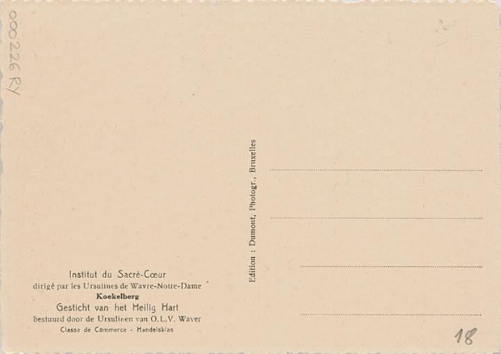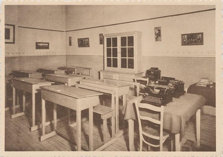 Illustrierte Postkarte; Fotografie, monochrom Rückseite: Unterrichtsraum mit Schreibmaschinen Vorderseite mit Beschreibungstext: Institut du Sacré-Coeur Koekelberg [...] Classe de Commerce