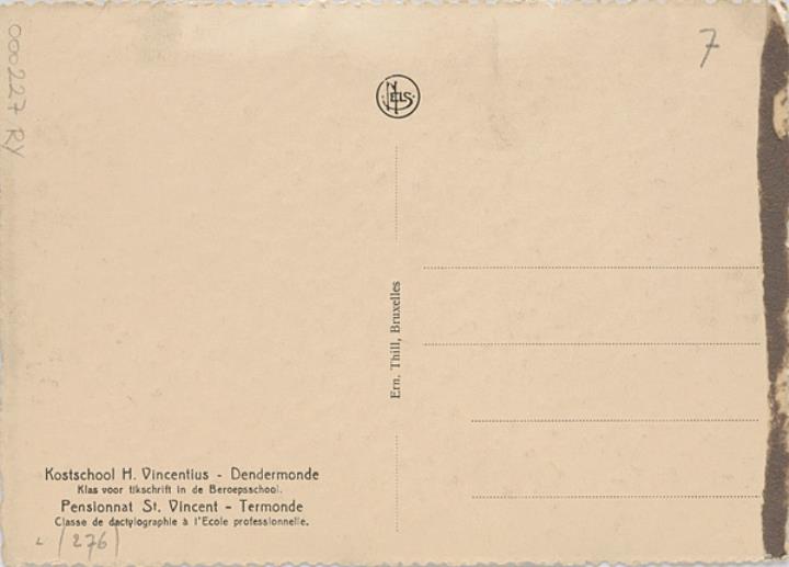 Illustrierte Postkarte; Fotografie, monochrom Rückseite: Unterrichtsraum mit Schreibmaschinen und Stenografiermaschine Vorderseite mit Beschreibungstext: Kostschool H. Vincentius - Dendermonde [...] Classe de dactylographie à l'Ecole professionelle