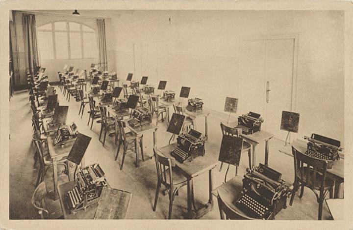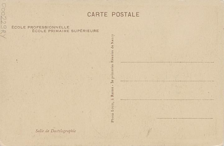 Illustrierte Postkarte; Fotografie, monochrom Rückseite: Unterrichtsraum mit Schreibmaschinen Vorderseite mit Beschreibungstext: École professionnelle École primaire supérieure. Salle de Dactylographie