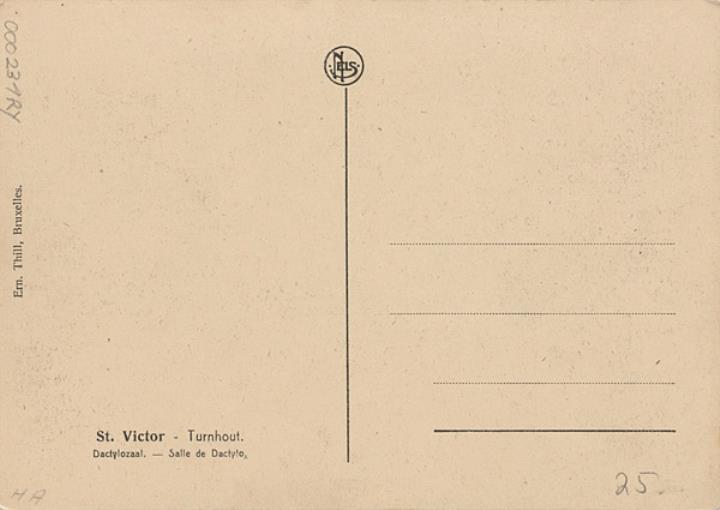 Illustrierte Postkarte; Fotografie, monochrom Rückseite: Unterrichtsraum mit Schreibmaschinen Vorderseite mit Beschreibungstext: St. Victor - Turnhout. Salle de Dactylo