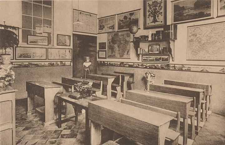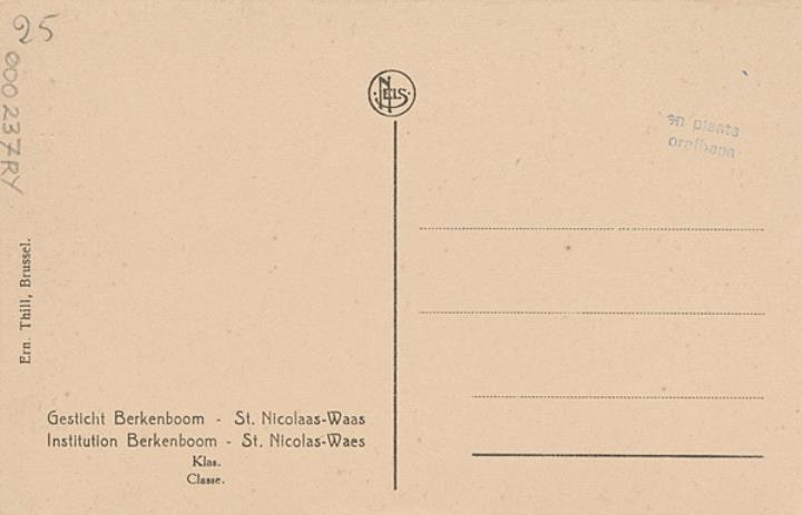 Illustrierte Postkarte; Fotografie, monochrom Rückseite: Unterrichtsraum mit Schreibmaschine Vorderseite mit Beschreibungstext: Institution Berkenboom - St. Nicolas-Waes. Classe