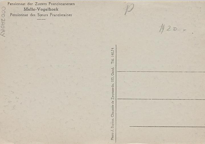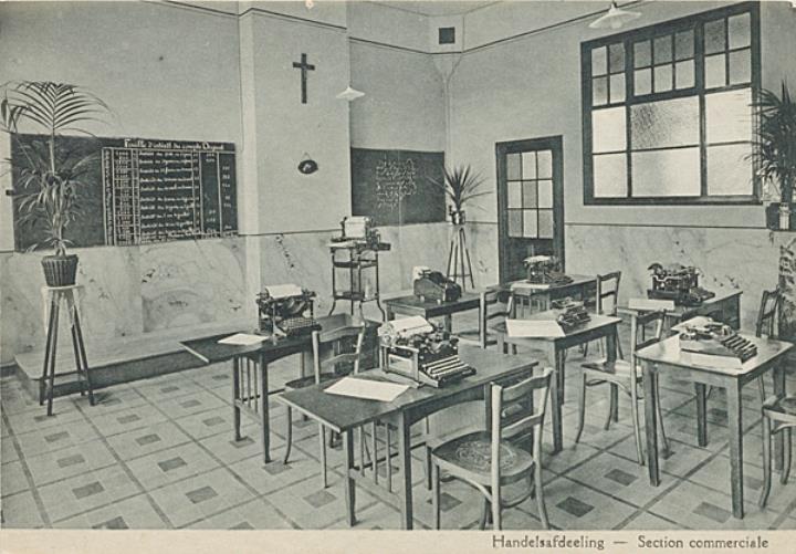 Illustrierte Postkarte; Fotografie, monochrom Rückseite: Unterrichtsraum mit Schreibmaschinen Vorderseite mit Beschreibungstext: Pensionnat des Soeurs Franciscaines