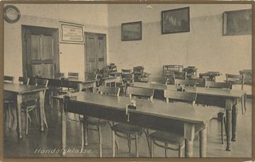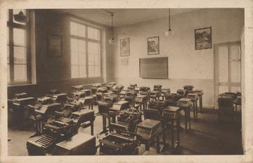 Illustrierte Postkarte; Fotografie, monochrom Rückseite: Unterrichtsraum mit Schreibmaschinen Vorderseite mit Beschreibungstext: Ecole Professionnelle et Méagère Ste Marie Luxembourg-Verlorenkost
