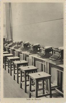 Illustrierte Postkarte; Fotografie, monochrom Rückseite: Unterrichtsraum mit zwei Schülerinnen beim Maschinenschreiben Vorderseite: beschrieben; adressiert an Mr. Jonné, Hoeylaert; Briefmarke Postes Belgique 5c (3fach); Poststempel Gysegem/5 VII 1921