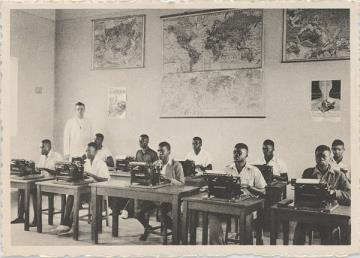 Illustrierte Postkarte; Fotografie, monochrom Rückseite: Unterrichtsraum einer Missionsschule; Lehrer und Schüler beim Maschinenschreiben Vorderseite mit Beschreibungstext: Missies van de Broeders Xaverianen [...] Klas voor Dactylographie
