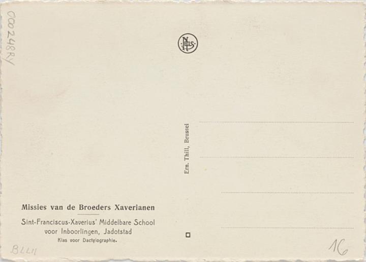 Illustrierte Postkarte; Fotografie, monochrom Rückseite: Unterrichtsraum einer Missionsschule; Lehrer und Schüler beim Maschinenschreiben Vorderseite mit Beschreibungstext: Missies van de Broeders Xaverianen [...] Klas voor Dactylographie