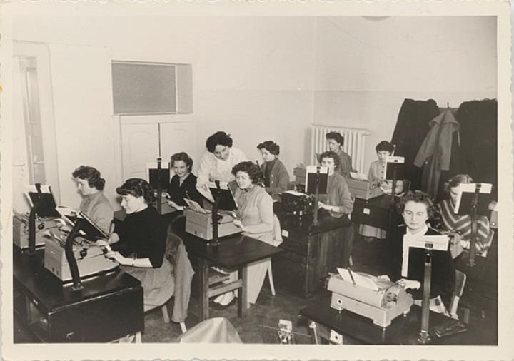 Illustrierte Postkarte; Fotografie, monochrom Rückseite: Unterrichtsraum mit Frauen/Schülerinnen beim Maschinenschreiben Vorderseite nicht beschrieben