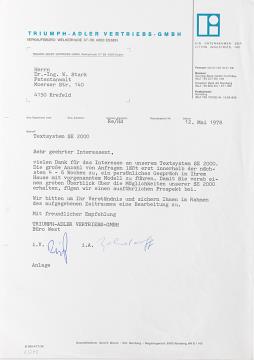 Brief der Triumph-Adler Vertriebs-GmbH, Nürnberg adressiert an Herrn Stark, Krefeld; datiert 12.05.1978 Maschinenschrift, unterschrieben