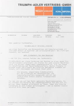 Rundschreiben der Triumph-Adler Vertriebs-GmbH, Nürnberg datiert Juni 1980; Maschinenschrift