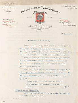 Brief der John Underwood & Co., Paris; datiert 15.06.1911 Maschinenschrift, unterschrieben