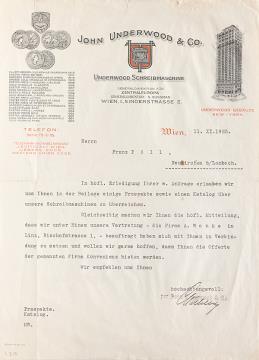 Begleitbrief zu Katalog der John Underwood & Co., Wien adressiert an Herrn Pöll, Neukirchen; datiert 11.11.1925 Maschinenschrift, unterschrieben