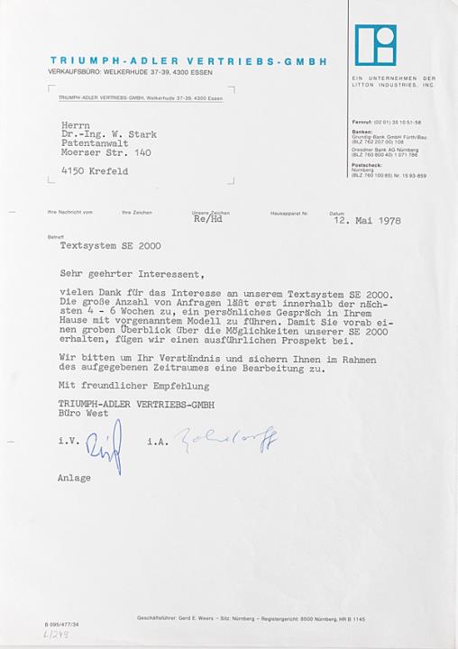 Brief der Triumph-Adler Vertriebs-GmbH, Nürnberg adressiert an Herrn Stark, Krefeld; datiert 12.05.1978 Maschinenschrift, unterschrieben
