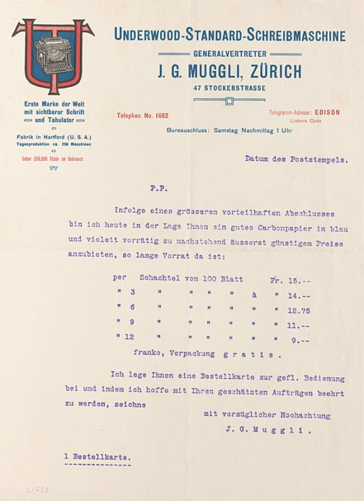 Rundschreiben der Schreibmaschinenhandlung J .G. Muggli, Zürich Maschinenschrift, Briefbogen mit Wasserzeichen "Colambo"