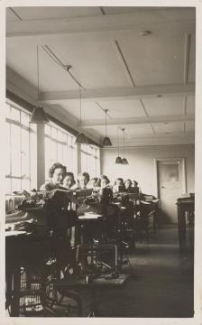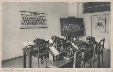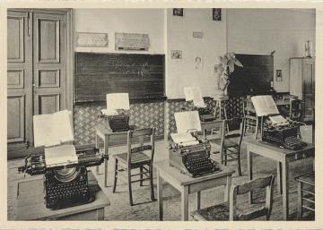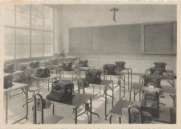 Illustrierte Postkarte; Fotografie, monochrom Rückseite: Unterrichtsraum mit Schreibmaschinen Vorderseite mit Beschreibungstext: Pensionnat des Soeurs de Marie-Glons. Section commerciale
