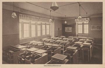 Illustrierte Postkarte; Fotografie, monochrom Rückseite: Unterrichtsraum mit Schreibmaschinen Vorderseite mit Beschreibungstext: Rastenburg, Ostpr. Städtische Haushaltungsschule
