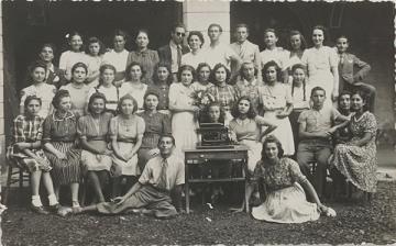 Illustrierte Postkarte; Fotografie, monochrom Rückseite: Aufnahme im Freien; junge Frauen und Männer posieren für ein Gruppenbild, in der Mitte ein Tisch mit Schreibmaschine Vorderseite mit Stempel: Foto Fortini Soncino