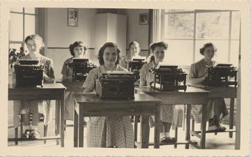 Illustrierte Postkarte; Fotografie, monochrom Rückseite: Büro/Unterrichtsraum mit jungen Frauen beim Maschinenschreiben Vorderseite nicht beschrieben