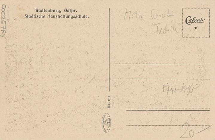 Illustrierte Postkarte; Fotografie, monochrom Rückseite: Unterrichtsraum mit Schreibmaschinen Vorderseite mit Beschreibungstext: Rastenburg, Ostpr. Städtische Haushaltungsschule
