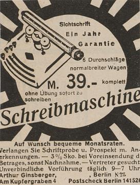 Schreibmaschine. Sichtschrift. Ein Jahr Garantie [...]