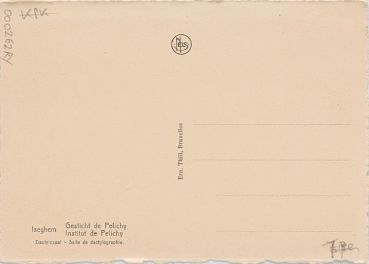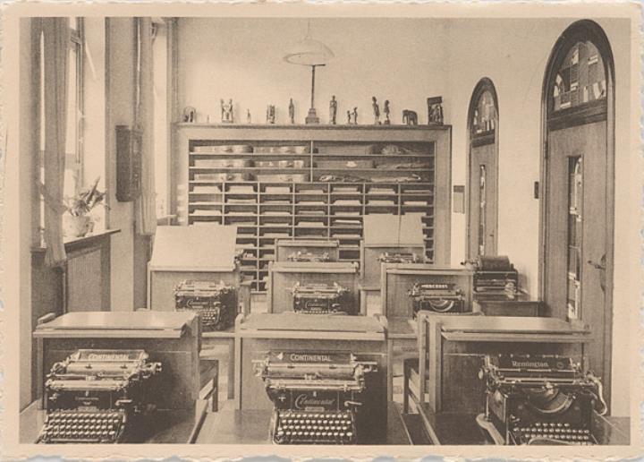 Illustrierte Postkarte; Fotografie, monochrom Rückseite: Unterrichtsraum mit Schreibmaschinen Vorderseite mit Beschreibungstext: Iseghem Institut de Pelichy - Salle de dactylographie
