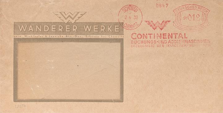Briefumschlag mit Firmendruck und Absenderfreistempel der Wanderer Werke; Nr. 0847 Stempel: Schönau b. Chemnitz/2.4.1932, Werbung Continental Buchungs- und Addiermaschinen, Wert Deutsches Reich 12 RPf.
