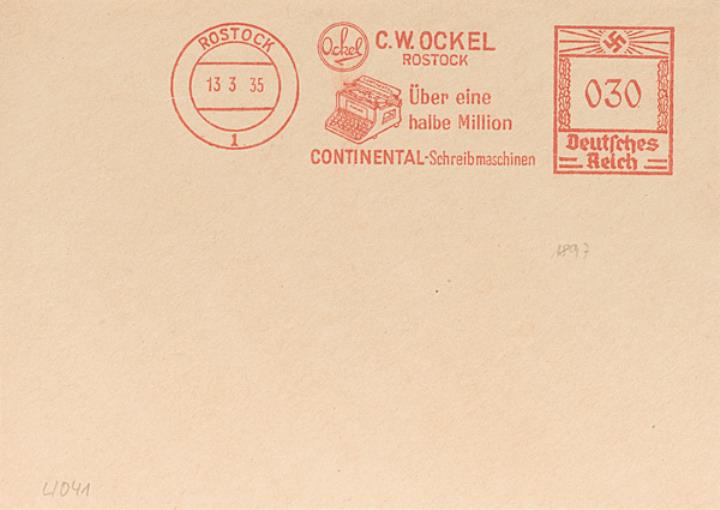 Vorderseite eines Briefumschlags mit Absenderfreistempel der Büromaschinenhandlung C.W. Ockel, Rostock Stempel: Rostock/13.3.1935, Werbung Continental-Schreibmaschinen, Wert Deutsches Reich 30 RPf.