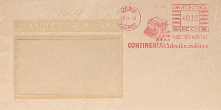 Briefumschlag mit Firmendruck und Absenderfreistempel der Wanderer Werke; Nr. 2152 Stempel: Schönau b. Chemnitz/15.2.1933, Werbung Continental-Schreibmaschinen, Wert Deutsches Reich 12 RPf.