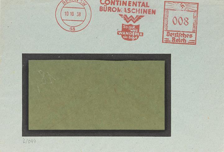 Briefumschlag mit Absenderfreistempel der Wanderer Werke A.G. Stempel: Berlin/10.10.1938, Werbung Continental Büromaschinen, Wert Deutsches Reich 8 RPf.