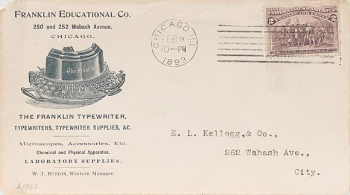 Briefumschlag mit Firmendruck der Franklin Educational Co., Chicago adressiert (Maschinenschrift) an E.L. Kellogg & Co.; Briefmarke U.S. Postage Two Cents; Poststempel Chicago/Feb 8 1893