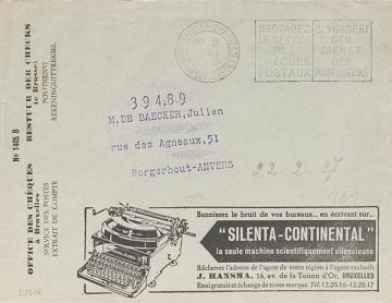 Postscheckumschlag mit Werbedruck für Schreibmaschine Silenta adressiert an M. De Baecker, Anvers; datiert Brüssel/22 II 1937 Rückseite mit Werbedruck der Firma René Quanjel