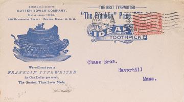 Briefumschlag mit Firmendruck der Cutter Tower Company, Boston adressiert (Maschinenschrift) an Chase Bros., Haverhill; Briefmarke U.S. Postage Two Cents; Poststempel Boston/Jul xx 1907