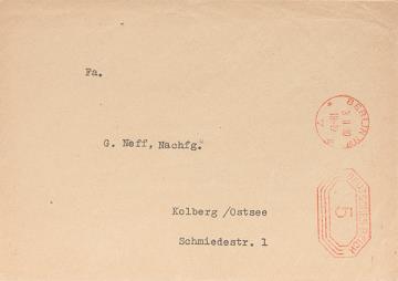 Briefumschlag mit Absenderfreistempel und rückseitigem Firmendruck der Fortuna Büromaschinen-Gesellschaft m.b.H., Berlin adressiert (Maschinenschrift) an Fa. G. Neff Nachfg., Kolberg Stempel: Berlin/03.11.30, Wert Deutsches Reich 5 RPf.