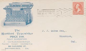 Briefumschlag mit Firmendruck der Schreibmaschinenhandlung J. Gunzendorfer, San Francisco adressiert (Maschinenschrift) an Quinn Esq., Stockton; Briefmarke U.S. Postage Two Cents