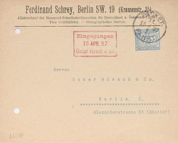 Briefumschlag mit Firmendruck der Schreibmaschinenhandlung Ferdinand Schrey, Berlin adressiert (Maschinenschrift) an Herren Oscar Hirsch & Co., Berlin; Briefmarke Berliner Packetfahrt 3 Pf.; Poststempel Packetfahrt/15.4.1897
