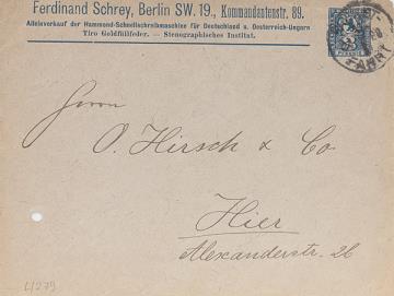 Ganzsache-Briefumschlag mit Firmendruck der Schreibmaschinenhandlung Ferdinand Schrey, Berlin adressiert (Handschrift) an Herrn Oscar Hirsch & Co., Berlin; Briefmarke Berliner Packetfahrt 3 Pf.; Poststempel unleserlich
