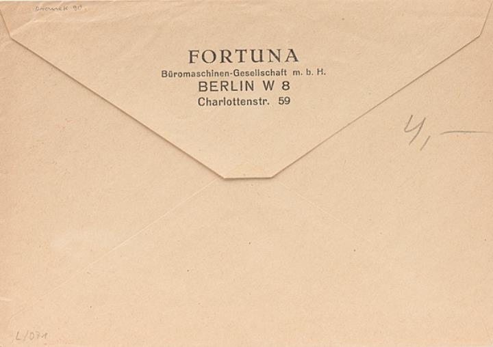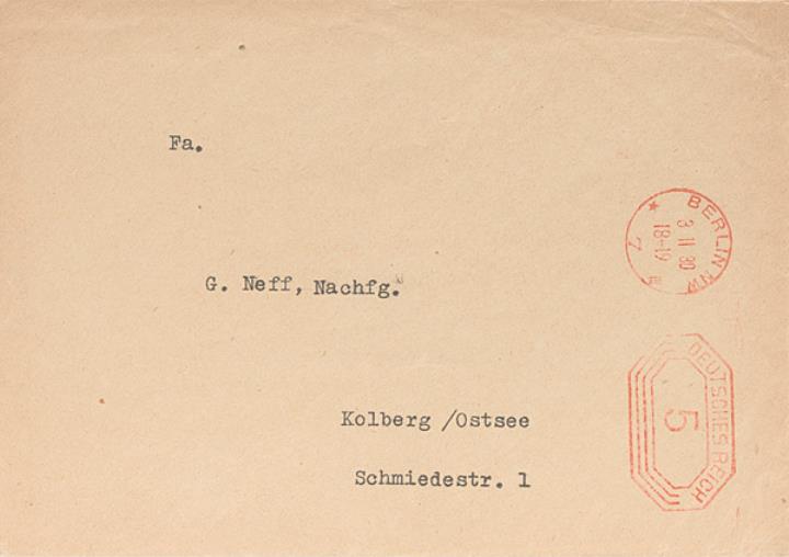 Briefumschlag mit Absenderfreistempel und rückseitigem Firmendruck der Fortuna Büromaschinen-Gesellschaft m.b.H., Berlin adressiert (Maschinenschrift) an Fa. G. Neff Nachfg., Kolberg Stempel: Berlin/03.11.30, Wert Deutsches Reich 5 RPf.