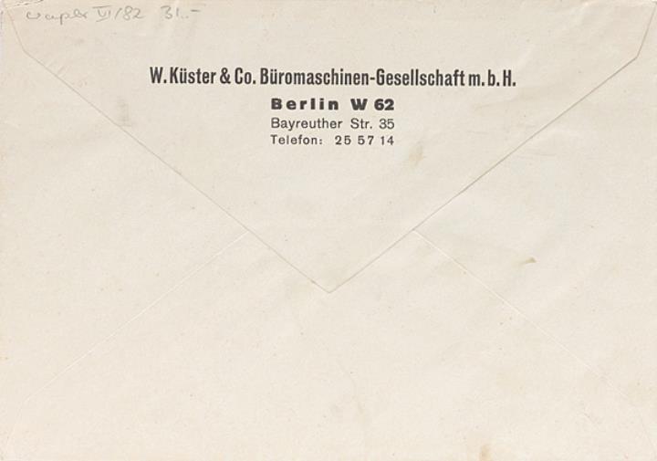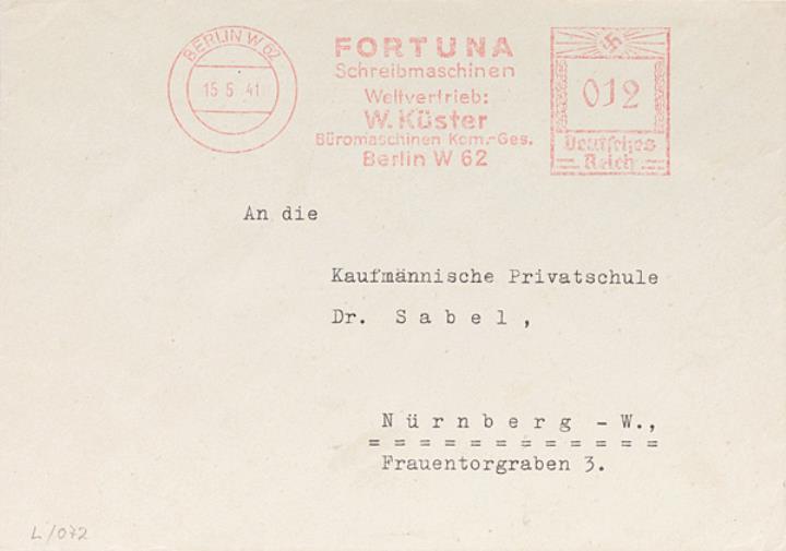 Briefumschlag mit Absenderfreistempel der Büromaschinenhandlung W. Küster, Berlin adressiert (Maschinenschrift) an die Kaufmännische Privatschule, Nürnberg Stempel: Berlin/15.5.1941, Werbung Fortuna Schreibmaschinen, Wert Deutsches Reich12 RPf.