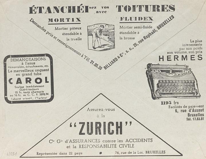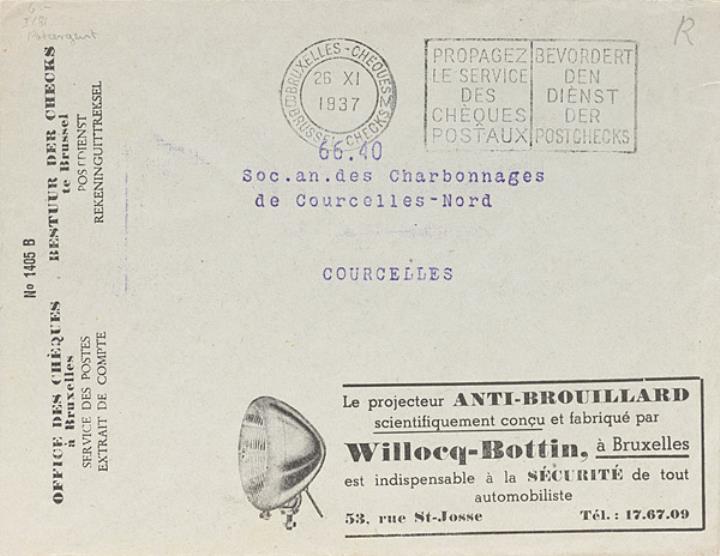 Postscheckumschlag mit Werbedruck für Scheinwerfer Willocq-Bottin adressiert an Soc.an. des Charbonnages, Courcelles; datiert Brüssel/26 XI 1937 Rückseite mit Werbedrucken, u.a. für Schreibmaschine Hermes