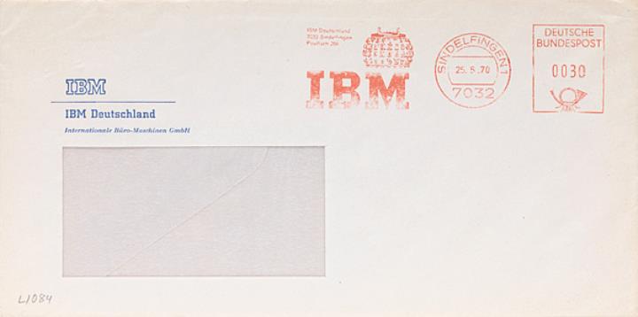 Briefumschlag mit Firmendruck und Absenderfreistempel der IBM Deutschland GmbH Stempel: Werbung IBM (Kugelkopf), datiert Sindelfingen/25.5.70, Wert Deutsche Bundespost 30 Pf.