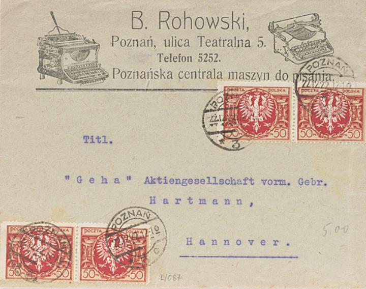 Briefumschlag mit Firmendruck der Schreibmaschinenhandlung B. Rohowski, Poznan adressiert an Geha Aktiengesellschaft vorm. Gebr. Harmann, Hannover; vier Briefmarken Poczta Polska/50 Mk; Poststempel Poznan/22.12.1922