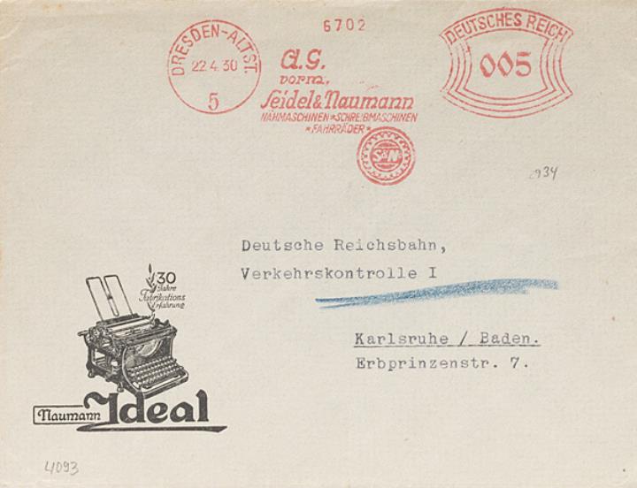 Briefumschlag mit Firmendruck und Absenderfreistempel der A.G. vorm. Seidel & Naumann; Nr. 5702 adressiert (Maschinenschrift) an Deutsche Reichsbahn, Karlsruhe/Baden Stempel: Dresden/22.4.30, Werbung Seidel & Naumann, Wert Deutsches Reich 5 RPf.