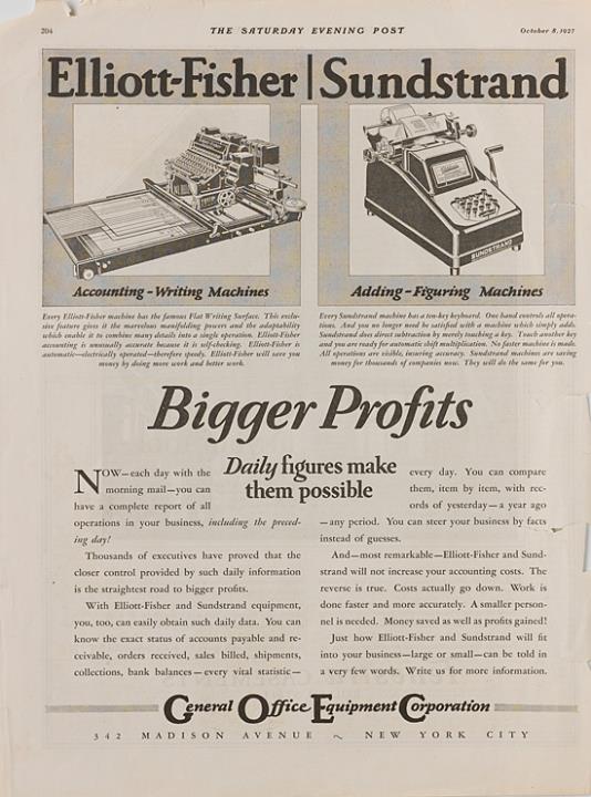 Zeitungsblatt (The Saturday Evening Post) mit Werbeanzeige für Schreibmaschine Elliott-Fisher und Rechenmaschine Sundstrand monochrom