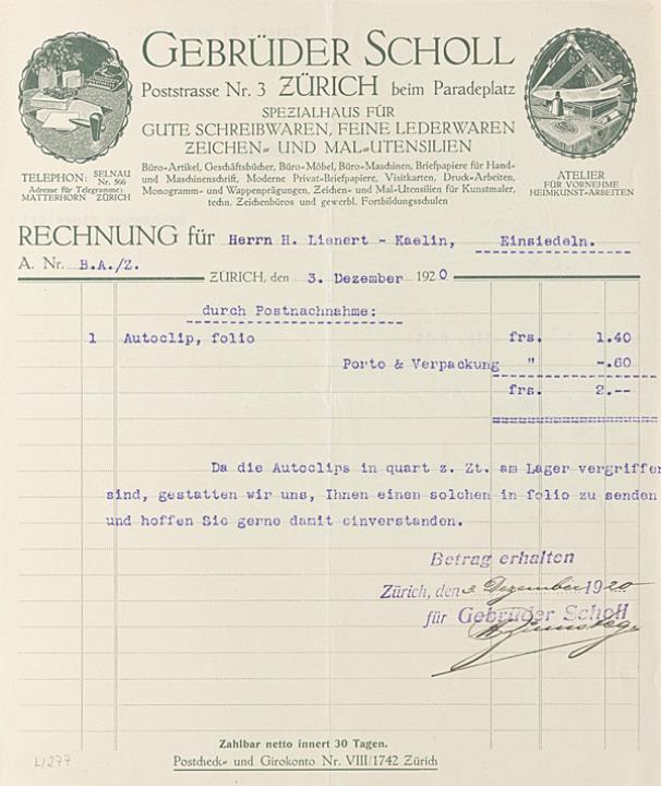 Rechnung Nr. B.A./Z. der Firma Gebrüder Scholl, Zürich adressiert an Herrn Lienert-Kaelin, Einsiedeln; datiert 03.12.1920 Maschinenschrift, unterschrieben
