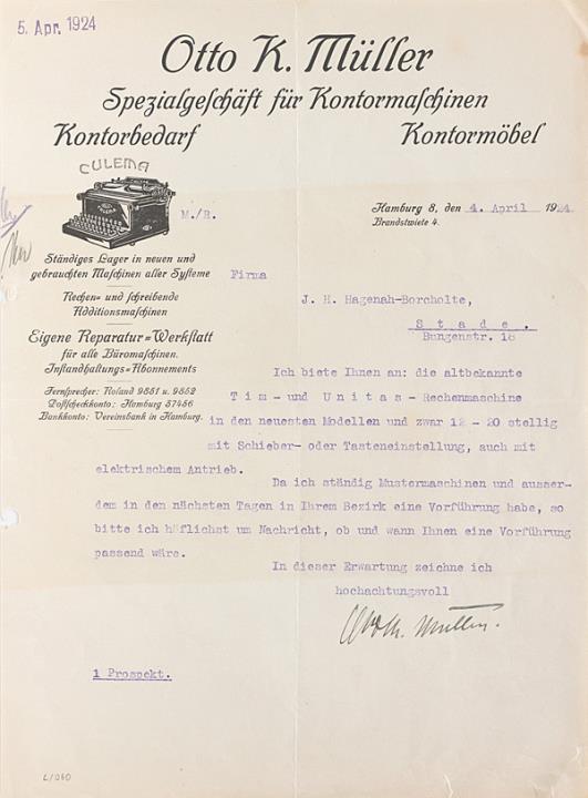 Brief der Büromaschinenhandlung Otto K. Müller, Hamburg adressiert an Firma J. H. Hagenah-Borcholte, Stade; datiert 04.04.1924 Maschinenschrift, unterschrieben