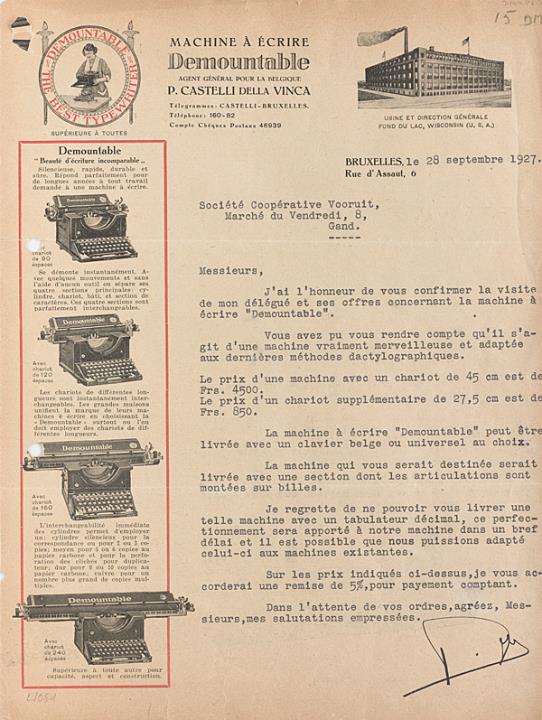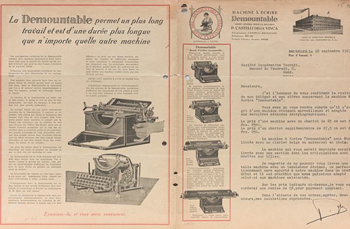 Brief der Firma P. Castelli della Vinca, Brüssel / Faltprospekt in französischer Sprache für Schreibmaschine Demountable adressiert an Société Coopérative Vooruit, Gand; datiert 28.09.1927 Maschinenschrift, unterschrieben