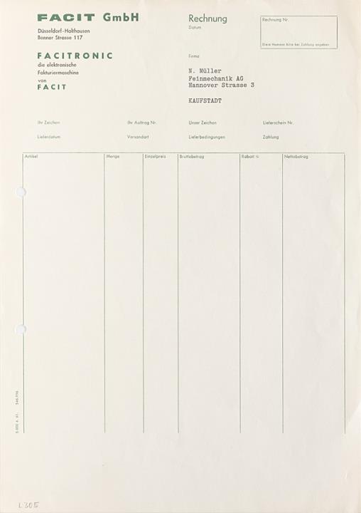 Briefbogen für Rechnungen der Facit GmbH adressiert (Maschinenschrift) an N. Müller Feinmechanik AG, Kaufstadt