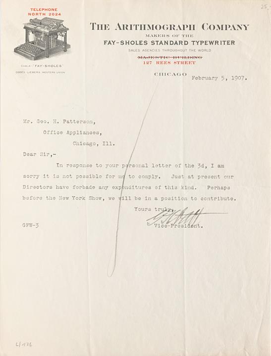 Brief der Arithmograph Company, Chicago adressiert an Mr. Patterson, Office Appliances, Chicago; datiert 05.02.1907 Maschinenschrift, unterschrieben; Briefbogen mit Wasserzeichen "Old Hamshire Bond"