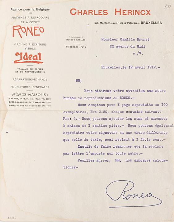 Werbebrief der Büromaschinenhandlung Charles Herincx, Brüssel adressiert an Monsieur Brunet, Bruxelles; datiert 12.04.1912 Maschinenschrift