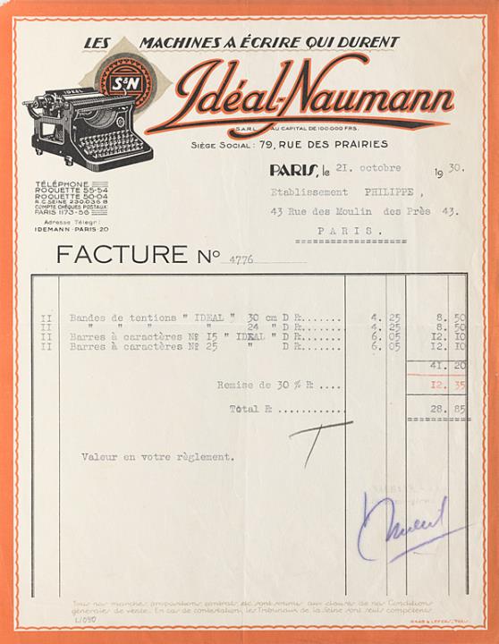 Rechnung Nr. 4776 der Ideal Naumann S.a.r.l., Paris adressiert an Etablissement Philippe, Paris; datiert 21.10.1930 Maschinenschrift, unterschrieben